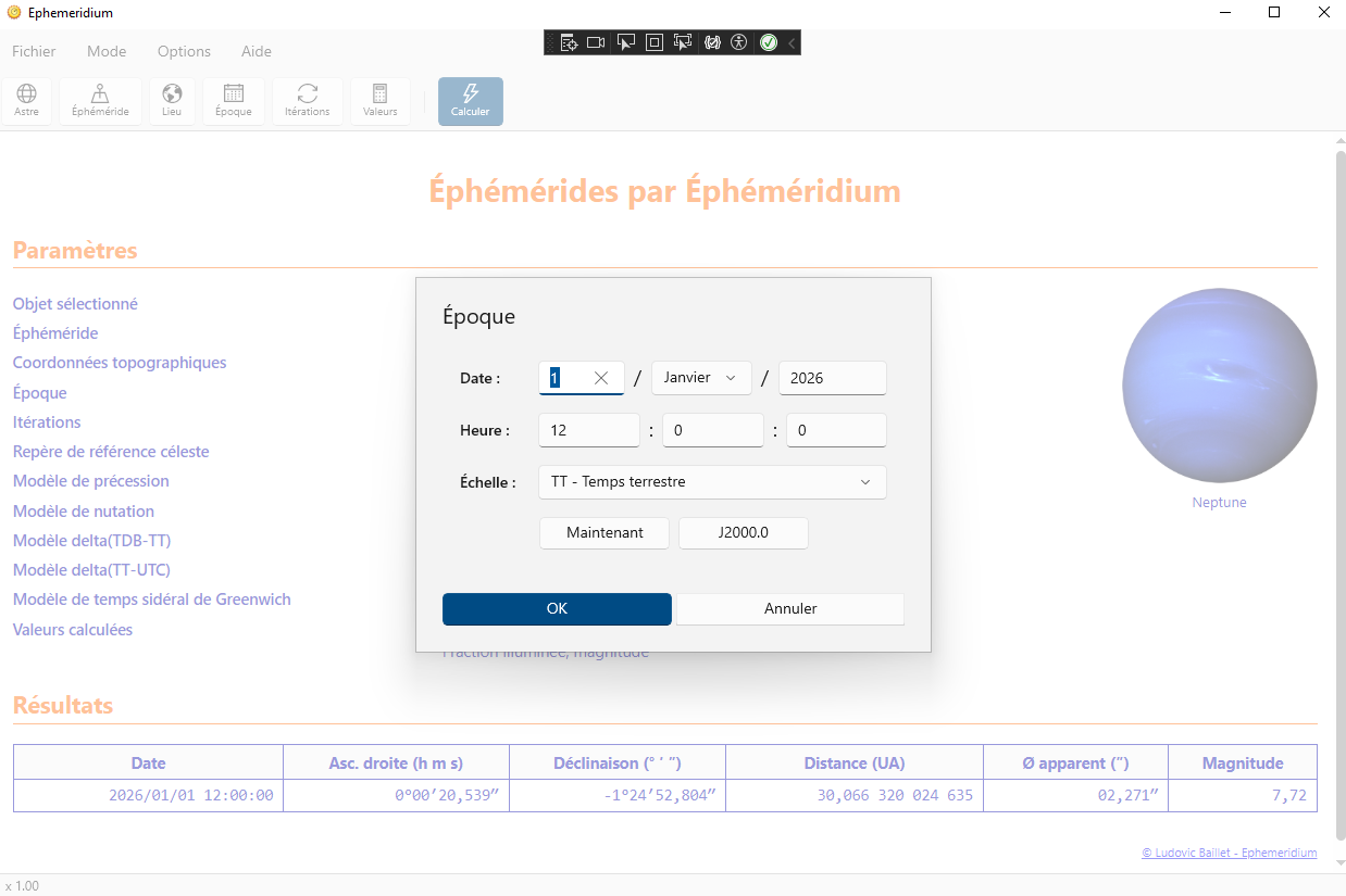 Cette boîte de dialogue permet de choisir l'époque initiale des éphémérides à calculer. Il est possible de choisir l'époque avec une précision de la seconde pour 3 échelles de temps. Si nécessaire je permettrai de pouvoir descendre à une précision au niveau de la milliseconde, le logiciel pouvant supporter de base une précision au niveau de la microseconde et ce sur une durée de plus de 250 000 ans dans le passé ou dans l'avenir.