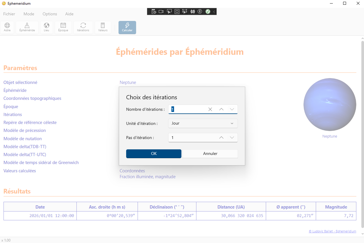 Cette boîte de dialogue permet de choisir les itérations de calcul à appliquer. Les pas d'itération possibles sont la seconde, la minute, l'heure, le jour, la semaine, l'année (en fait 365,2425 jours).