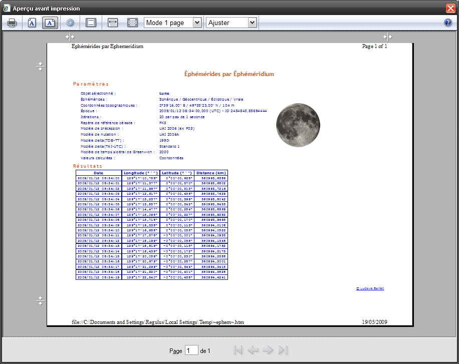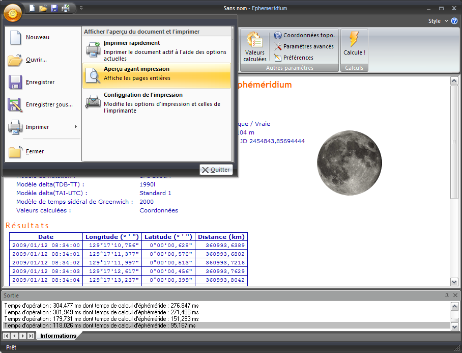 Éphéméridium a des capacités d'impression depuis la première version diffusée. Pour imprimer un résultat, cliquer sur l'icône principale de l'application en haut à gauche aller dans le menu imprimer et cliquer sur le sous-menu Aperçu avant impression. Comme sur l'exemple ci-dessous :